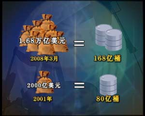 盡管高油價給美國本國也帶來影響,但譚雅玲認為在美國的策略組合當中,美元貶值可以化解他國內石油價格上漲帶來的負面壓力,但是對其他國家的影響則全然不同,2001年,中國官方外匯儲備達2000億美元,國際石油價格在每桶25美元左右,中國可以購買80億桶;2008年3月,中國官方外匯儲備是世界第一,達到1.68萬億美元,以石油價格100美元計算,中國可以購買168億桶。也就是說,雖然中國外匯儲備增長7倍多,但真實購買力只是原來的1倍。德國經濟學家,《石油戰爭》的作者威廉恩道爾在接受本欄目記者電話采訪時直接指出。