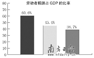 ◎2000年—2006年間,勞動者報酬占GDP的比率從45.4%降到38.7%,6年降低了6.7個百分點。如果與改革開放初1978年的60.6%相比,下降幅度則達21.9個百分點。