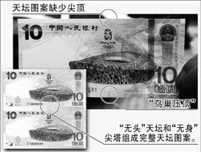 此次發行的奧運紀念鈔正面主景圖案為北京2008年奧林匹克運動會主會場——國家體育場建筑圖案,其上方為第29屆奧林匹克運動會會徽圖案,背景輔以世界文化遺產——天壇剪影輪廓示意圖。但一些收藏者發現,天壇的壇頂出現在“鳥巢”圖案的下方。