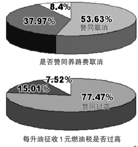在是否贊同養路費取消,改成一升油征收1元燃油費的調查中,83043人贊成費改稅,占53.63%,有58799人反對費改稅,占37.97%,而另有13003人表示不好說,占8.4%。該調查顯示,到記者截稿為止,贊同費改稅的網民超過半數,顯著高于其他兩種意見。