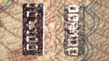 第四種偽造安全線是第二種和第三種的組合,既有燙印開窗,又有實物安全線置于紙張夾層內(nèi)。(見下圖)