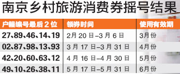 此次發(fā)放活動的旅游券消費時間為3月-6月,不過鄉(xiāng)村旅游消費券標(biāo)有使用月份,按月使用,有效期為當(dāng)月。本次搖號方式,根據(jù)江南八區(qū)居民戶口簿編號的最后兩位數(shù)字進行搖號,分別搖出3、4、5、6月份鄉(xiāng)村旅游消費券的發(fā)放戶口簿號碼,每個月為一組,每組為5個號碼。