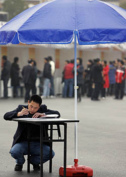 不少人跨坐在被褥卷上,縮著手邊閑聊邊焦急地等待“雇主”出現,更多的人不停地在寒風中來回走動,一看到有招工模樣的人,就馬上涌過去。記者的車剛在路邊停下來,就有七八個農民工迅速圍上來,急切地詢問招什么工,幾秒鐘時間又有十幾個人涌過來。