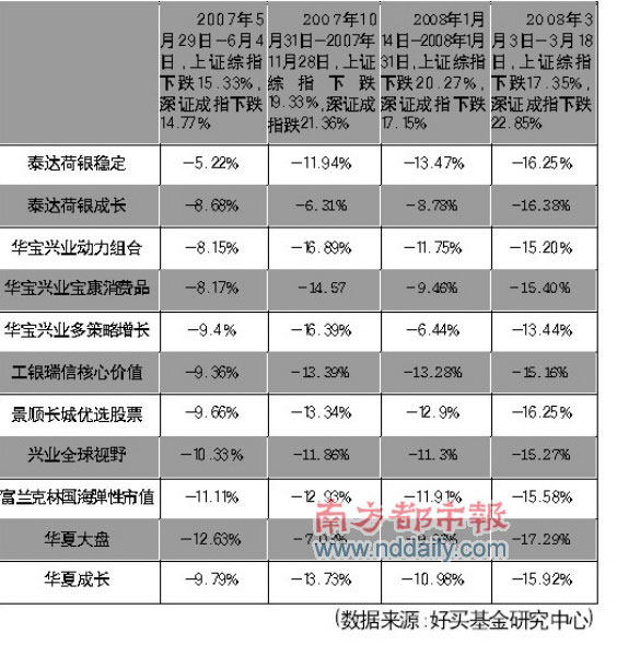 3月份以來,受到股市拖累的股票型基金,凈值下跌最少的也有10%,最多損失超過24%.然而同樣是凈值縮水,今年以來績優(yōu)與績差基金之間的差距居然高達(dá)30%,尋找抗跌的基金已經(jīng)成為今年基金投資的一個(gè)主要命題。好買基金研究中心樂嘉慶指出,從去年5月底至今,股市共經(jīng)歷了4個(gè)跌幅超過15%的階段。在4個(gè)階段中比較抗跌的基金表現(xiàn)出兩大特點(diǎn),一是行業(yè)投資比較均衡的基金,另一個(gè)則是規(guī)模適中,倉位調(diào)整迅速的基金。