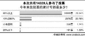 上周,中國證券網(wǎng)進行了“今年來您投基累計虧損為多少”的調查,獲得了投資者廣泛關注,共有14328人參與了投票。結果顯示,有10909名投資者損失達到了80%以上,達到全體投票者總數(shù)的76.14%。選擇虧損在40%-60%的基民人數(shù)為2978,占投票者總數(shù)的20.78%。191名投資者損失低于20%,占投票者總數(shù)的1.33%。只有250名基民表示,今年以來小有盈利,僅占全部投票者的1.74%。