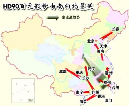 1月8日,央行就此事在北京召開記者招待會,央行貨幣金銀局局長葉英男澄清了HD90版假幣“高仿真”的傳言。部分城市的警方已經(jīng)就假幣事件立案調(diào)查。然而,透過沸沸揚揚的假幣風(fēng)波,人們不禁要問,如此大規(guī)模的假幣事件頻發(fā),背后是怎樣一只無形的黑手?一條由南向北、自東向西的假幣蔓延路徑,漸漸浮出了水面……