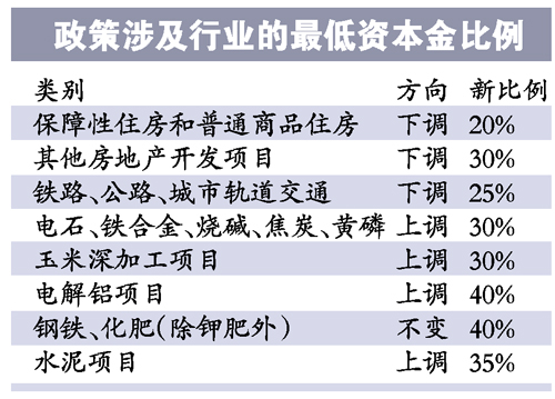 根據(jù)此次調(diào)整,大部分行業(yè)的最低資本金比例下調(diào)了5~10個百分點(diǎn),其中保障性住房和普通商品住房項(xiàng)目下調(diào)15個百分點(diǎn),大大超出此前的預(yù)期,而鐵路、公路等交通和大型基建項(xiàng)目也是此次資本金比例調(diào)整的主要受益對象。高污染、高能耗和產(chǎn)能過剩的項(xiàng)目則被上調(diào)最低資本金比例。