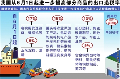 財政部和國家稅務(wù)總局昨天發(fā)布公告,從6月1日起,國家再次上調(diào)部分產(chǎn)品的出口退稅率,涉及我國優(yōu)勢產(chǎn)品、勞動密集型產(chǎn)品、高技術(shù)含量產(chǎn)品和深加工產(chǎn)品共計2600多個10位稅號商品。這是我國今年內(nèi)第3次上調(diào)出口退稅率,也是自去年8月以來第7次上調(diào),預(yù)計此次上調(diào)出口退稅率將增加退稅資金約252億元。