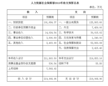 據人社部網站消息顯示,根據《財政部關于批復人力資源和社會保障部2010年部門預算的通知》(財預[2010]205號),人社部2010年預算情況如下: