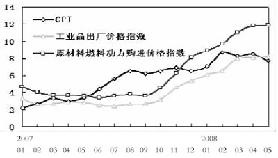 當前經濟生活中面臨的主要問題有:通貨膨脹壓力較大,煤電油運供應趨緊,農業增長基礎尚不牢固,金融機構的流動性過剩,資產價格特別是股市價格波動較大,節能減排形勢嚴峻等。其中,最為突出的問題是通貨膨脹壓力較大。今年2月至4月,我國居民消費價格指數(CPI)連續3個月漲幅超過8%,5月份CPI同比上漲7.7%,環比下降0.4%,其主要原因是蔬菜水果的產銷逐漸進入旺季,帶動食品價格漲幅有所回落。但今年下半年CPI仍將面臨較大的上漲壓力,主要表現在如下幾個方面: