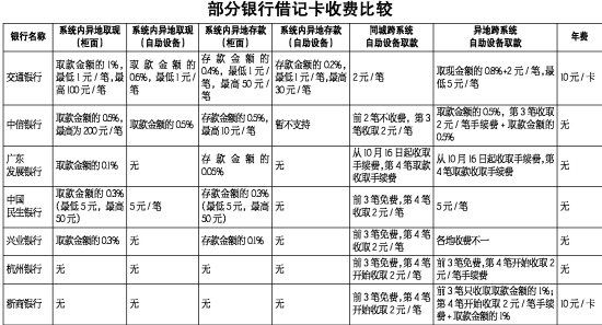 根據(jù)目前杭州各家銀行公布的收費(fèi)標(biāo)準(zhǔn)看,四大銀行的銀行卡收費(fèi)標(biāo)準(zhǔn)是最高的。記者咨詢了多家銀行的收費(fèi)標(biāo)準(zhǔn),市民在選辦銀行卡時(shí),不妨做個(gè)比較。(黃丹)