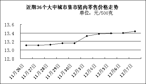 中新網(wǎng)12月10日電 國家發(fā)改委網(wǎng)站消息稱,據(jù)國家發(fā)展改革委價(jià)格監(jiān)測中心監(jiān)測,上周(12.3-12.7,下同)全國36個(gè)大中城市集市豬肉(精瘦肉)平均零售價(jià)格每500克為13.39元,比上期(11.26-11.30,下同)上漲1.98%。