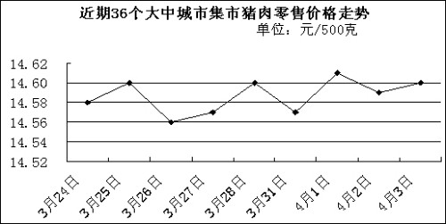 中新網(wǎng)4月7日電 國(guó)家發(fā)改委網(wǎng)站消息稱,據(jù)國(guó)家發(fā)展改革委價(jià)格監(jiān)測(cè)中心監(jiān)測(cè),上周(3.31-4.4,下同)全國(guó)36個(gè)大中城市集市豬肉(精瘦肉)平均零售價(jià)格每500克為14.59元,比前一周(3.24-3.28,下同)上漲0.07%。
