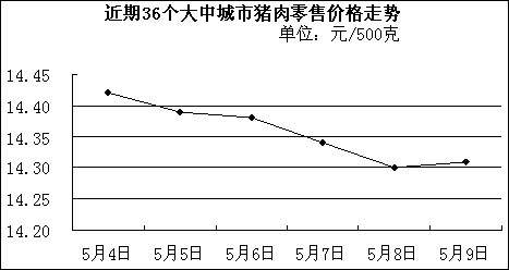 中新網5月12日電 國家發改委網站消息稱,據國家發展改革委價格監測中心監測,上周(5.5-5.11,下同)全國36個大中城市豬肉(精瘦肉)平均零售價格每500克為14.34元,比前一周(4.28-5.4,下同)下降0.76%。