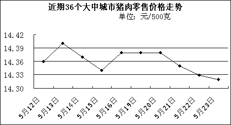 中新網5月26日電 中國國家發改委網站消息,據國家發改委價格監測中心監測,上周(5月19日—5月23日)36個大中城市豬肉(精瘦肉)平均零售價格每500克為14.35元,比前一周(5月12日—5月16日)下降0.14%。