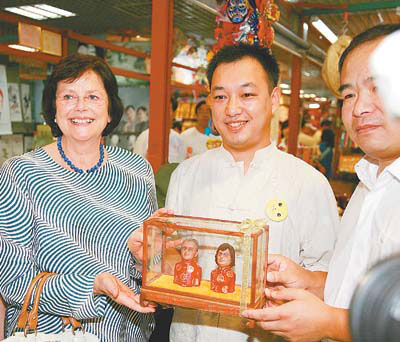 8月11日上午,羅格夫人安妮來到名聞海外的北京秀水街。一見“面人楊”師傅拿出的兩對精美的面人塑像,她笑了起來。