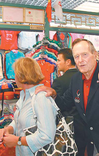 18號攤主用英語推薦中國的手繡龍鳳睡袍。老布什和女兒一起挑了6件手繡睡袍。買完睡袍,老布什笑問還有什么要求,兩位中國姑娘毫不猶豫地說:“我們想與您一起照相。”老布什欣然答應。