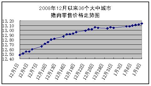 中新網1月12日電 據國家發改委網站消息,據國家發展改革委價格監測中心監測,上周(2009年1月5日~2009年1月9日,下同)全國36個大中城市集市、超市豬肉(精瘦肉)平均零售價格每500克為13.11元,與前一周(2008年12月29日~2008年12月31日,下同)相比上漲0.46%。