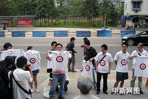 中新網重慶4月17日電 (銀雪 郭虹)17日,重慶市物價局舉行改革主城區公交票價聽證會,倍受當地市民關注。聽證會結束時,一群重慶市民在會場外身穿或手舉反公交漲價T恤,反對公交車票價上漲。