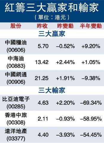 紅籌指數成分股上半年整體回報率為負22%,表現最令投資者失望的,是比亞迪電子,股價累跌69%。回顧年初時,比亞迪電子股價曾經飆升至15.5元的歷史高位,可謂無緣無故的上升,到大市興奮過后,終于回復理性,比亞迪電子股價亦落葉歸根,昨日收報4.63元。此外,香港中旅(00308)是第二大跌幅股份,上半年下跌58%,收報2.11元。分析員解釋,市場去年憧憬中旅獲注資、分拆業務上市,刺激股價暴升,如今遂作出回調。
