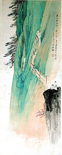 此外,張大千描繪華山長空棧道險(xiǎn)峻奇崛的《華山行》,以145.6萬元成交。張大千于1935年游浙江莫干山、洛陽龍門及西安、華山,并為此舉辦了“關(guān)洛紀(jì)游畫展”,《華山行》即創(chuàng)作于此時(shí)。在似青綠山水卻又色不重的大片綠中,畫一長空棧道,著以赭色,十分醒目。空棧上端點(diǎn)兩游者,相背、扶壁而立,一者小心看風(fēng)景,似不敢再往前;一者已有悔意,正想返身而下,這正應(yīng)和了畫面的款識(shí)“予每度來游,皆中道而返”,或許是大千自己的寫照吧。