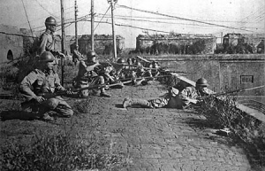 一九三一年九月十九日日軍在沈陽外攘門上向中國軍隊進攻。