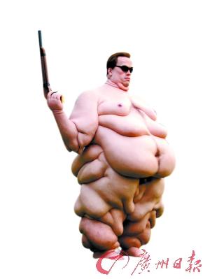 一座220厘米高、以美國明星施瓦辛格為原型創作的“肥胖”雕塑,近日起在錦漢展覽中心首屆“藝術廣東”上展出。其夸張而荒誕的手法呈現出一種詭異的表現力。這是藝術家舒勇于2006年至2008年創作的硅膠雕塑,他表示其創作背景來自因美國爆發的金融危機而引發的全球金融海嘯。