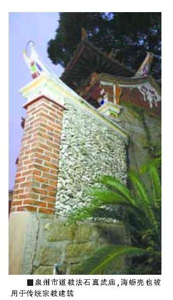 然而就在小洋樓之間,記者見到了蟳埔的另一個特色——用海蠣殼蓋成的房子,當地稱作“蚵殼厝”。特別是在老房子集中的村落,“蚵殼厝”一個連著一個,細細看去別有風味。有些人家蓋新房的時候依舊選用海蠣殼做材料,不過裝飾的意味要超過就地取材的功能了。記者在村中走訪時就看到了一處新建的院落,外墻的上半部用海蠣殼填充,裝飾得非常漂亮。院子里面男人、女人分別圍著一個大桌子吃午飯,中間隔得很遠。女人們都插著滿頭的鮮花,根據記者幾天來了解的情況分析,這一天應該是對這個家庭非常重要的日子。院子里正對大門的是祠堂,房子的女主人告訴記者,他們建這個院子花了30萬元,平時并沒有人住,這里只是供奉、祭祀祖先的地方。