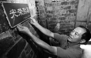 海口瓊山區龍寒村抗美援朝烈士吳業忠之子吳田川,展示政府頒發的光榮烈屬的牌匾。 海南日報記者 李英挺 攝
