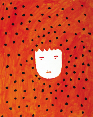 郭海平問記者:“如果是你,會(huì)如何表達(dá)‘掙扎’的抽象精神?”隨即他讓記者看了張玉寶的作品:沖擊力極強(qiáng)的橘紅色背景上,被扎上了無數(shù)個(gè)錯(cuò)亂且刺眼的黑點(diǎn),它們環(huán)繞在一個(gè)人頭四周,人臉表情有些呆滯。色彩強(qiáng)烈的反差,讓人感覺周圍恐怖的背景,隨時(shí)可能將人頭吞噬,人頭似在苦苦掙扎。整個(gè)畫面是那么干凈,但內(nèi)涵卻非常豐富。無論如何,你都不能猜到這是一個(gè)未經(jīng)任何繪畫訓(xùn)練的人畫出來的東西。