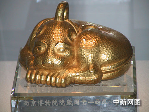 記者隔著玻璃窗看到,一只脖套項圈的金豹身覆鱗片,半蹲于座,鱗片在燈光映照下閃爍,光彩灼人,整座展品有著強烈的立體感!斑@叫金獸,古時作保財鎮庫之用,迄今為止仍是中國出土文物中最大最重的金器”,南京市博物院院長龔良如是說。