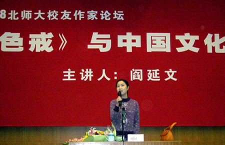 日前,女作家閻延文應母校北師大文學院邀請,在北師大針對文化熱點問題,進行了一場題為《色戒與中國文化》的講座。英東學術會堂,在講座開始前即已爆滿,兩個小時的講座始終處在熱烈氣氛中。
