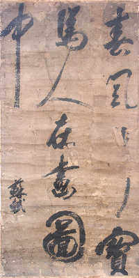在中國書壇占有極重要地位的蘇軾,目前存世書法作品僅數(shù)十件,均藏于博物館,范圍也限于手卷、書帖、橫披等中小字形。“《春風(fēng)》這件姍姍來遲的‘大手筆’,彌補(bǔ)了因缺乏大幅作品而導(dǎo)致的蘇派書法體系的不完整。”徐啟雄昨天說,“數(shù)月前,一位外地收藏者帶藏品來杭州找我鑒定真?zhèn)巍!毙靻⑿弁嘎叮@幅僅存內(nèi)芯、名為《春風(fēng)》的中堂大軸草書高165厘米、寬65厘米,紙面發(fā)黃發(fā)暗,部分已腐化剝落,落款為“蘇軾”,另有“蘇軾”、“東坡居士”兩方隱約可辨的印章。上書“春風(fēng)寶馬人在畫圖中”,“春風(fēng)”后缺一字,其余每字高、寬在30-60厘米,最后的“中”字高62厘米。