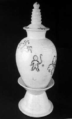 出土的兩件唐代青花塔形罐在同一墓室中,形狀相同,由蓋、罐、底座三部分組成,白瓷胎。器蓋呈塔剎狀,剎座為一覆碟剎身。一罐身飾“童子打曲棍球”、牡丹圖案,另一罐上則飾有萬字符等紋樣。罐身所繪“曲棍球”圖案引人注目,圖案中的人物叉腿而立,右腿微曲,左手揚彎形球桿,左側有一圓球,形象生動。