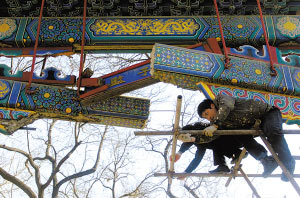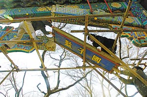 昨日11時許,東城區國子監街,工人在被撞的國子監牌樓下搭起腳手架,進行初步搶修。昨日凌晨5時許,該牌樓被一輛施工挖土車撞斷橫梁。事后交警封鎖了該道路,警方對肇事司機進行了調查。文物局稱橫梁修繕資金將控制? onkeypress=