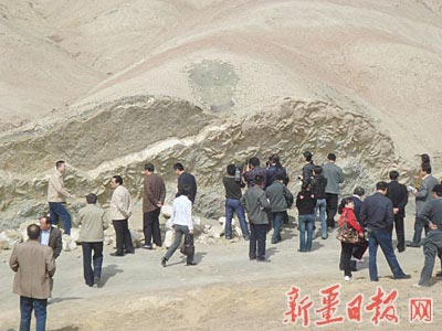 2008年4月10日,記者隨中德新疆野外科考隊專家,前往恐龍足跡化石現場。