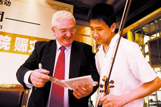 樂團小提琴演奏家布萊德·道切特為朱可贈送樂團CD。(記者李紅艷 周南焱)