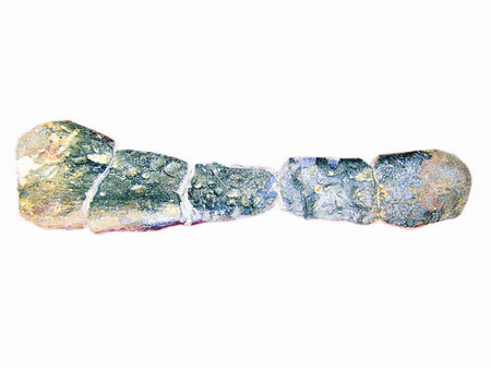 目前,已挖掘出土的化石有股骨、趾骨、和一些關節骨頭,已收集骨頭30多塊。還有部分骨化石包裹在巖石里面,株洲市文物局已運回兩車巖石,將對其進行切割、清理。考古人員將恐龍化石的趾骨、股骨拼湊起來,經測量趾骨約20厘米,股骨長約77厘米,接近屁股段的股骨化石寬約22厘米,考古專家推測其腿部高在2米以上,據此可推斷是巨型恐龍。