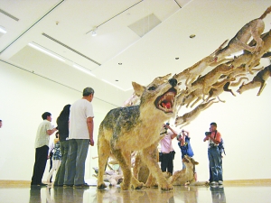 東側(cè)展廳則是七輛通體插滿霓虹電燈管的汽車形態(tài)各異地翻滾著,似乎是“爆炸”以后的狀態(tài)的慢鏡頭記錄。蔡國(guó)強(qiáng)說(shuō)這件名為《不合時(shí)宜:舞臺(tái)一》的作品是他有感于層出不窮的自殺式人肉炸彈事件,于是把車行進(jìn)、爆炸的場(chǎng)面分解成慢鏡頭———用九輛不同位置、姿勢(shì)的車來(lái)表現(xiàn)這個(gè)過(guò)程,表達(dá)一種身體上的痛楚和不確定感。而西側(cè)有99匹羊皮縫制的模型狼沖向一堵玻璃墻的作品《撞墻》。這是蔡國(guó)強(qiáng)2006年在柏林創(chuàng)作的作品,他說(shuō)每匹狼的翻滾姿態(tài)都經(jīng)過(guò)嚴(yán)密設(shè)計(jì),既漂亮又暴力,啟動(dòng)、攻擊而又被挫敗的場(chǎng)景讓這個(gè)隱喻冷戰(zhàn)的作品有了一絲美感。