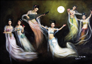 朱澤斌還講述了靈感的來源:“一輪月光照著寒冷朦朧的天空,6個仙女在廣寒宮周圍飛翔著、舞蹈著。她們身穿著宮衣、游泳衣和運動衣組合的服飾,飛到一起來了,飛向了廣州。去年中秋節凌晨,此情此景進入了我的夢中。第二天醒來,我把夢中見到的便作了這幅畫!