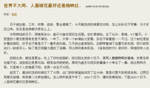 中新網(wǎng)10月23日電 今天凌晨中國(guó)女星徐靜蕾更新了自己曾號(hào)稱“第一博客”的博客,不過(guò),在這篇題為“世界不大同,人面桃花最好還是相映紅”的文章中卻出現(xiàn)硬傷,將一個(gè)十二生肖循環(huán)算成了十年的3650天。有網(wǎng)友回帖對(duì)此提出質(zhì)疑,認(rèn)為其數(shù)典忘祖。