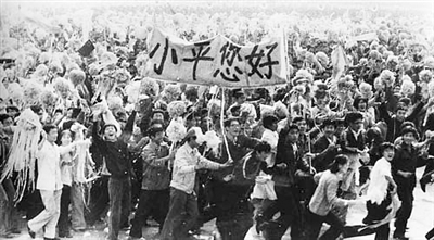 當北大學生方隊走到天安門金水橋東華表時,常生、李禹、于宏實等同學一下子打開橫幅,隊伍歡騰起來。這個時候,我們的帶隊老師喊:“快跑,快跑!”于是,隊伍便開始跑起來。跑過去之后,我的心咚咚在跳。后來有人說小平同志看到橫幅笑了,我沒看見。