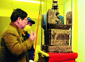 昨天下午3時28分,南京市博物館和晨光集團的專家成功地將長干寺“塔王”請出鐵函。從8月6日在鐵函內發現寶塔,到昨天借助機械手請出寶塔,專家小組經過整整109天的研究論證和科技攻關,終于將迄今為止世界上發現的體積最大的阿育王塔完整地呈現在世人眼前。