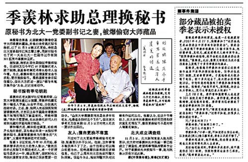 然而,有關渠道昨日披露的數段有關人士早先攝錄的季羨林視頻,畫面上思路、語言清晰的季老表達了對“丟畫”和北大聲明的看法,季羨林說:“(丟畫)千真萬確,我知道。當面叫你季爺爺、季爺爺,背后偷你的畫偷畫的事情,誰也掩蓋不了。” 自稱拍得大批“季羨林珍貴書畫”的收藏家張衡10月份爆出季羨林收藏被盜賣的消息,隨后,新華社記者唐師曾在博客披露此事,季老的秘書楊銳成為被懷疑對象之一。11月初,北大給季老增派助手并成立調查組。隨后幾天,北大發表聲明:外流拍賣字畫并非季老真藏,季老秘書保管的季老藏品并未外流。11月26日,北大通報調查結果:“舉報人”手中字畫全系偽作,“盜賣沒有任何根據”。