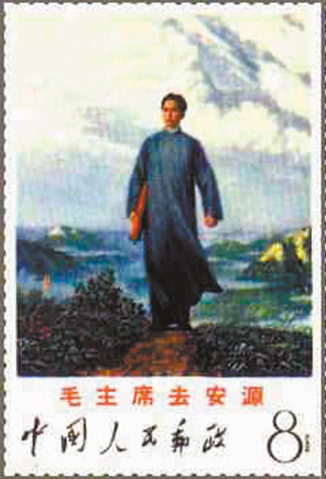 1968年8月1日,中國發(fā)行了一枚面值8分的郵票,是根據(jù)《毛主席去安源》的油畫設(shè)計的。圖中,毛澤東身穿藍布長衫,手拿雨傘,在烏云翻滾的天空下凝神走來,非常形象傳神。