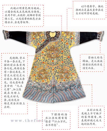“錦衣玉食”常被用來形容奢華的生活狀態,而在中國傳統的各種服飾中宮廷帝王穿著的龍袍算得上是頂級華服了。昨天,包括乾隆、嘉慶、光緒皇帝龍袍在內的30件清宮服飾在北京港澳中心舉行的北緯拍賣預展現場亮相。