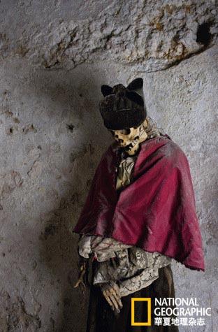 美麗小鎮諾瓦拉有一座規模宏大、富麗堂皇的教堂。祭壇前方有一扇通向地下密室的暗門,只需撳動一個隱藏的按鈕,電控開關就會把門打開,如同007電影中的情景。下了臺階就能看到一列壁龕,存放著衰敗程度各不相同的主教尸體。他們坐著鑿了些圓孔的小石椅(供體液滲流),面容僵直,像是在一起享受公廁里的放松時刻。一座擺滿了頭骨的高架子上有個盒子,里面裝著兩具自然干化的貓尸,恍若古埃及的魅影。它們困在這地下墓室里,提醒著人們:即使真有九條命,歸宿也只有一種。 (來源:《華夏地理》雜志 )