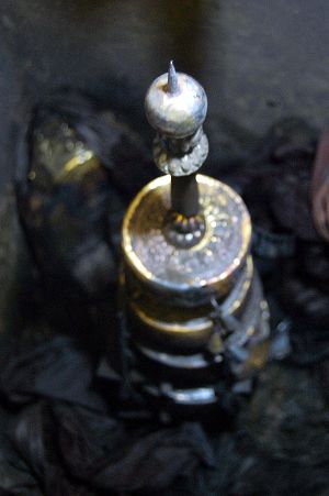 考古學家已經論定,這座塔的制造地在揚州,制造時間為宋真宗大中祥符四年。但是疑惑又來了,如此高規格的七寶阿育王塔究竟是民間奉養還是皇家供奉?據悉,宋真宗祥符年間,長干寺地下的佛祖舍利常常顯靈。為此,真宗敕命重新整修長干名寺,并在寺內放置9層“圣感舍利塔”。就此論證,七寶阿育王塔具有皇家供奉的特點,但是出土的實際情況卻大異其趣。因為從鐵函內發現的文字看,供奉者卻是來自民間,供奉人的名字都是稀松平常的“三哥”、“四郎”、“大娘”等。而且,在塔基上還發現了“皇帝萬歲”等字,更說明這座七寶阿育王塔的民間屬性。