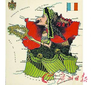法國地圖,創作者用長著鷹鉤鼻的貴婦來表現法國。