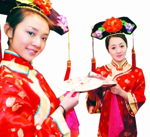 無論民間、官場(chǎng)在宴會(huì)的時(shí)候一定是男女分席,沒有說夫婦兩人擠在一個(gè)桌子上的。還有,八仙桌最多坐六個(gè)人。清裝戲里不該有大圓桌,大圓桌是民國(guó)以后才有,而且只能坐九人,不能坐十人,正對(duì)面留一個(gè)菜口。